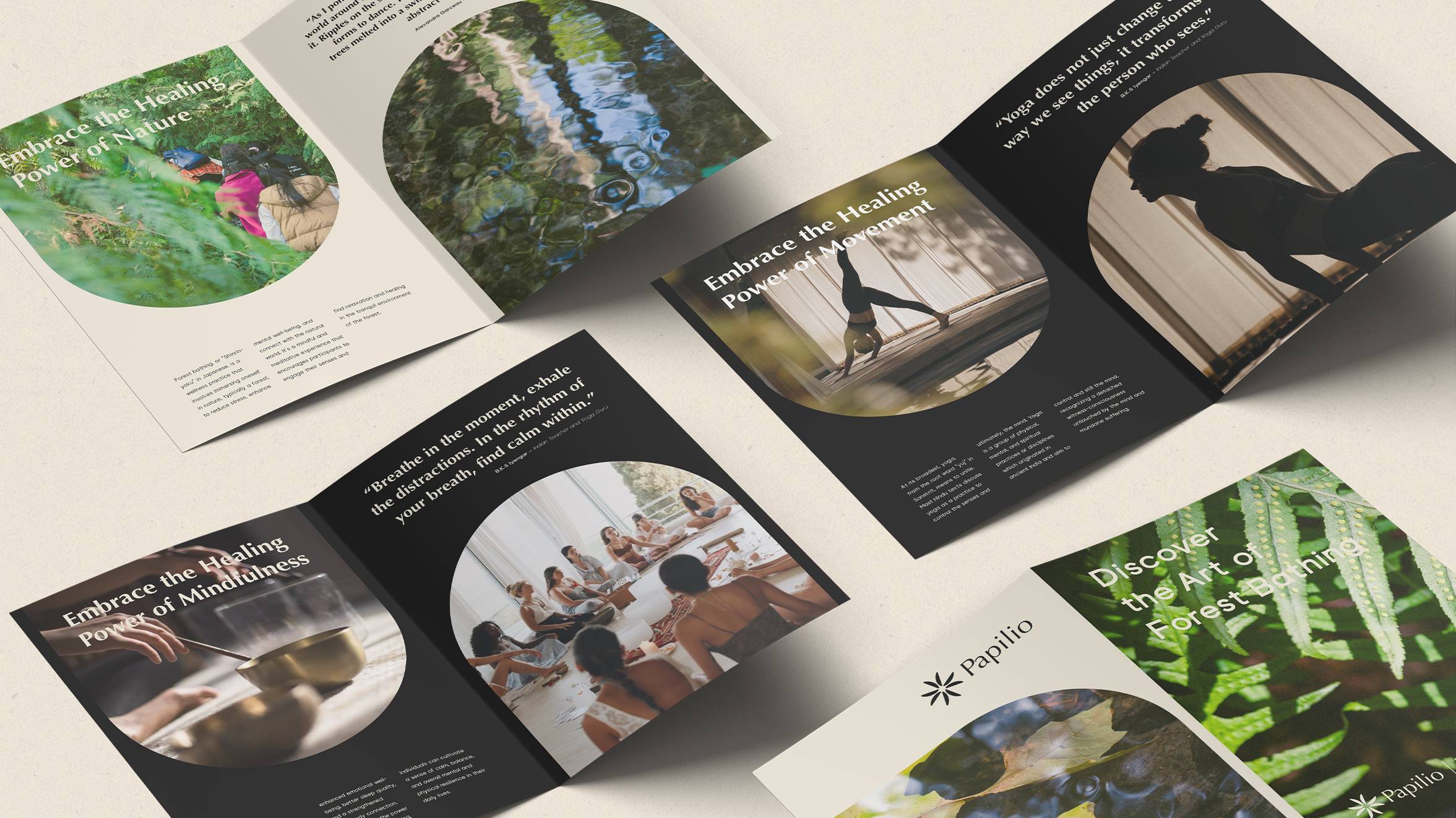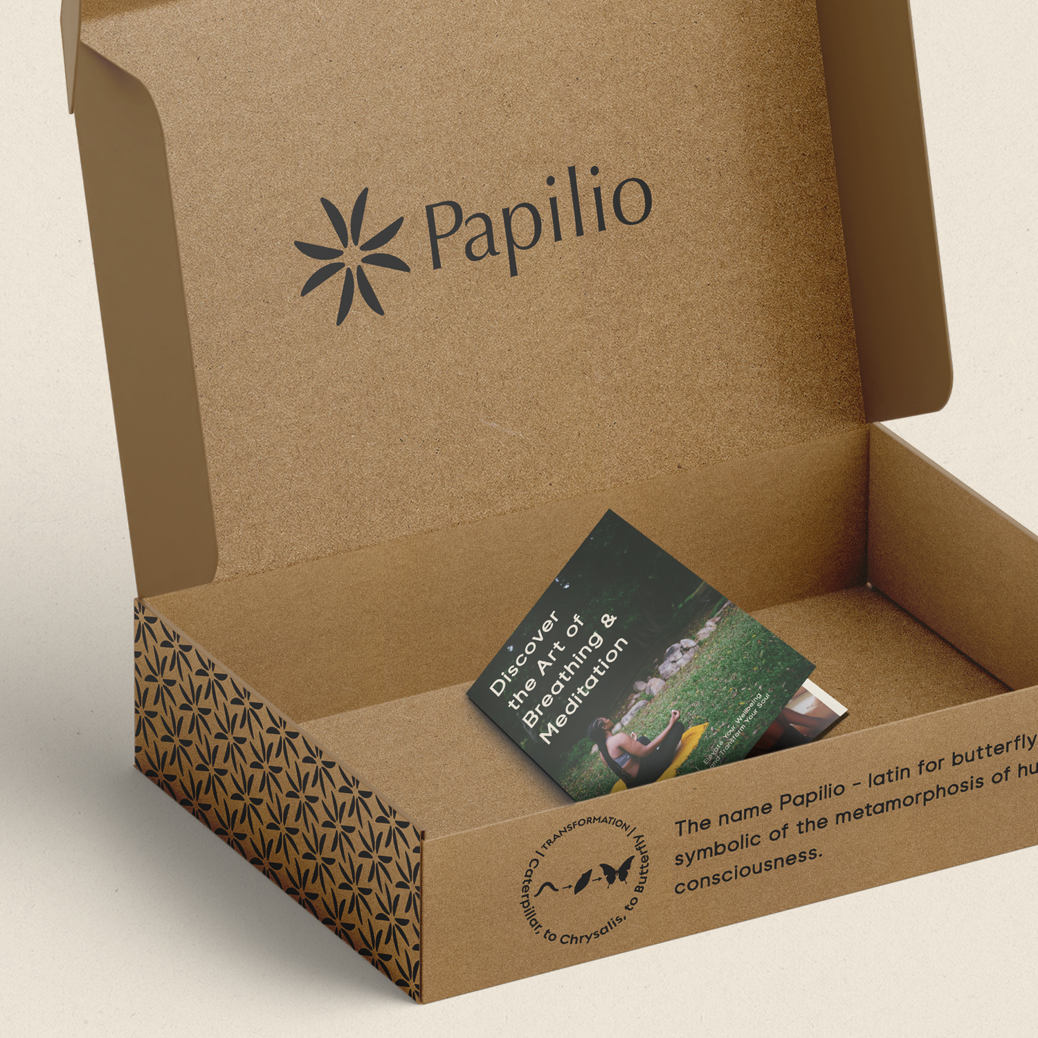 To promote the new ethos of the brand, I also produced a series of brochures to educate customers, and introduce ways to partner Papilio’s products with mindfulness, movement, and lifestyle practices to further enhance effectiveness. These brochures were mass produced and shipped to the customer with each purchase.